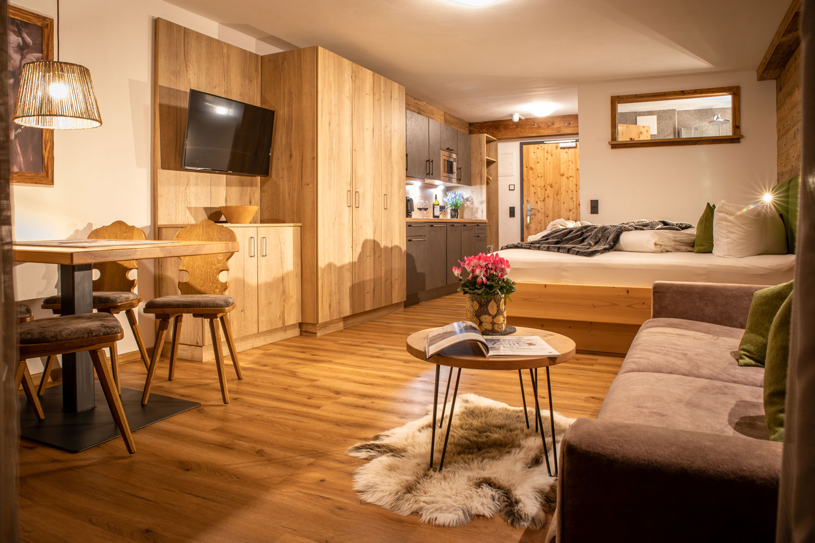 Die Einraum-Ferienwohnungen Allgäu Natur plus mit 35 qm sind im alpinen Stil eingerichtet. Die Wandvertafelung aus Allgäuer Hölzern in Verbindung mit dem Laminatboden verleihen dem Studio Apartment ein besonders warmes Wohlfühlambiente. Der kombinierte Wohnschlafraum mit Doppelbett ist ideal für einen Aufenthalt zu zweit. Eine gemütliche Eck-Couch lädt zum Kuscheln und Tagträumen ein. Bei Bedarf kann sie auch als bequemes, zusätzliches Bett für zwei Personen umfunktioniert werden. Von Balkon oder Terrasse aus eröffnet sich das eindrucksvolle Allgäuer Berg-Panorama nach Süden mit Blick in die Oberstdorfer und Kleinwalsertaler Bergwelt. Die kleine aber feine Küchenzeile ist für eine 4 Personen Belegung ausgestattet. Das Badezimmer beinhaltet Dusche und WC.