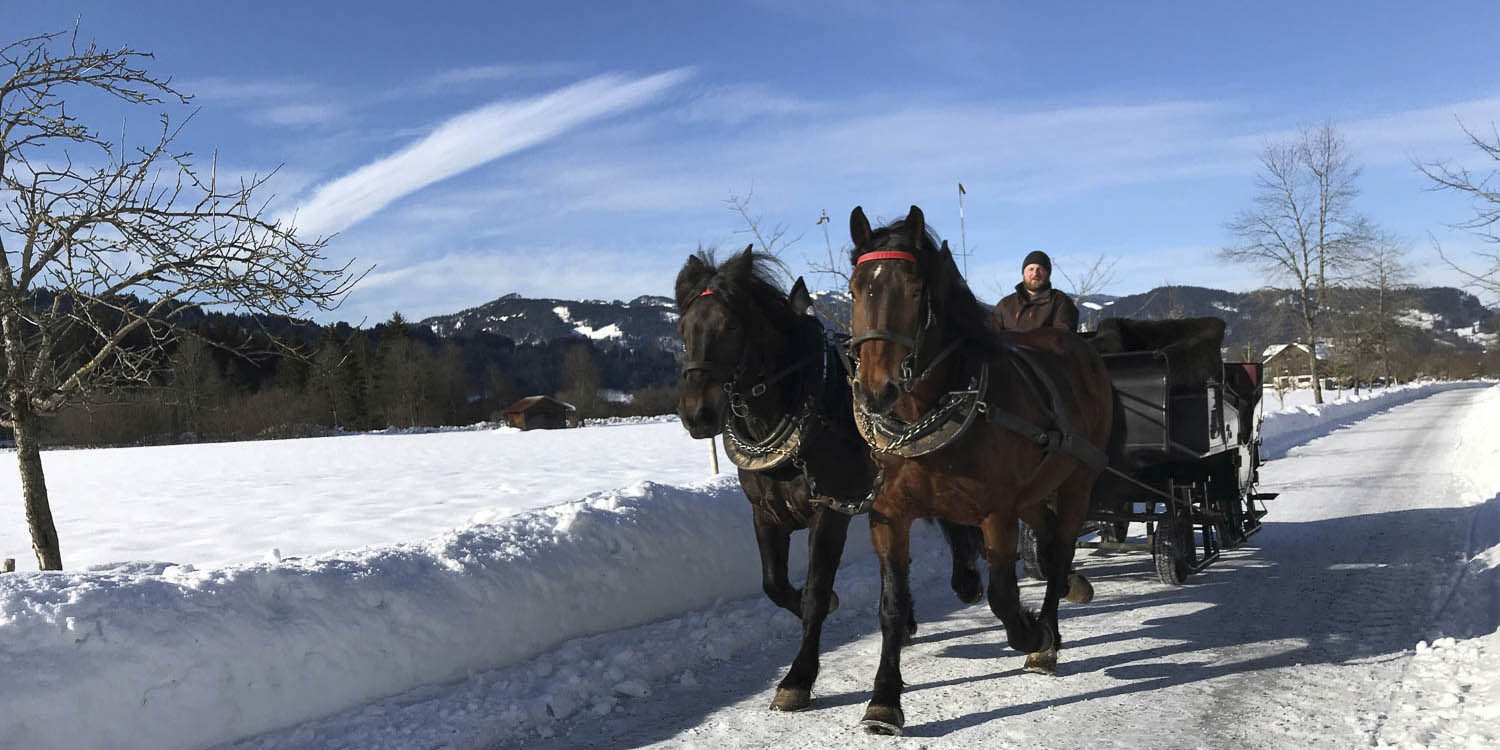 Sie wünschen sich die perfekte Verbindung von Ruhe, Entspannung, Romantik und Nostalgie, dazu ein unvergessliches Urlaubserlebnis, bei dem Sie die einzigartige Natur unseres wunderschönen Allgäus hautnah und ganz entspannt erleben können? Dann ist eine Kutsch- oder Schlittenfahrt in eines der wunderschönen Oberstdorfer Seitentäler genau das Richtige für Sie. Hier ist der Weg das Ziel. Ruhe, Entspannung und Gemütlichkeit lösen den Stress des Alltags ab und Sie genießen beim Blick auf das Postkartenpanorama des Allgäuer Hochalpenkammes, gepaart mit dem Zauber der Langsamkeit, Entschleunigung pur. Ob üppig blühende Bergwiesen mit der Kutsche im Sommer oder gar eine Fahrt mit dem Pferdeschlitten durchs tief verschneite, romantische Winterwonderland im Winter, ein Ausflug mit 2 PS in die traumhafte Umgebung rund um den Brunnenhof und ins Naturschutzgebiet Rohrmoostal ist immer ein faszinierendes Erlebnis und wird Ihnen sicher als ganz besonderes Urlaubshighlight in Erinnerung bleiben.